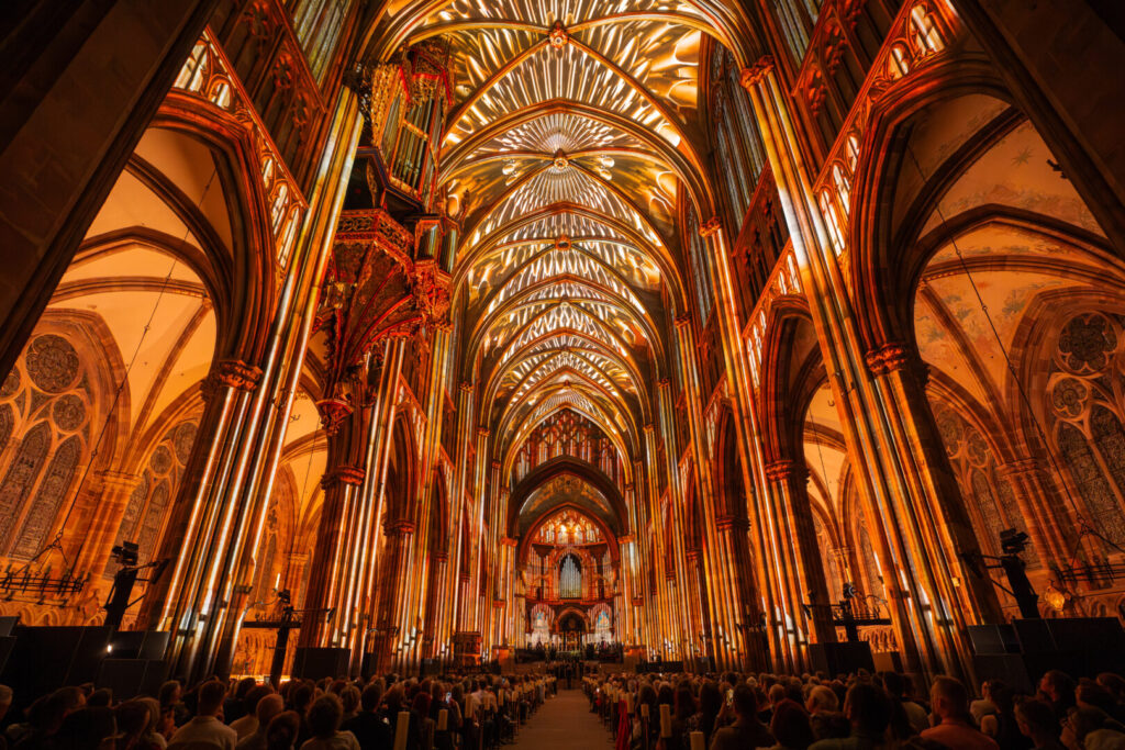 Chef-d’œuvre de l’art gothique, la cathédrale de Strasbourg est un monument millénaire classé au patrimoine mondial de l’UNESCO. Autrefois le plus haut édifice du monde, elle reste aujourd’hui le plus haut bâtiment de pierre de France. Avec sa flèche de 142 mètres, sa façade en grès rose sculptée, ses vitraux médiévaux et son horloge astronomique, elle s’impose comme l’un des joyaux du patrimoine européen. C’est dans ce cadre que Luminiscence propose une expérience sensorielle inédite, mêlant vidéo mapping à 360°, musique live et narration immersive. Grâce à une modélisation 3D de l’édifice, les projections révèlent avec précision chaque détail, chaque voûte, chaque élévation.