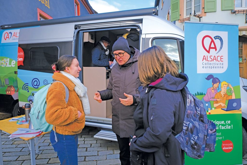 La fracture numérique est un problème qui touche 300 000 Alsaciens et qui crée des inégalités grandissantes. Pour lutter contre celle-ci, la Collectivité européenne d’Alsace a recruté quatre conseillers numériques qui accueillent le public dans les centres médico-sociaux et au sein du Digibus. Dans les centres médico-sociaux, comme ceux d’Obernai, Barr, Molsheim, Erstein ou Benfeld, ils accompagnent les personnes qui expriment le besoin d’être soutenues dans leur utilisation de l’ordinateur, de la tablettes et d’Internet. Quant au Digibus, il sillonne les territoires ruraux.