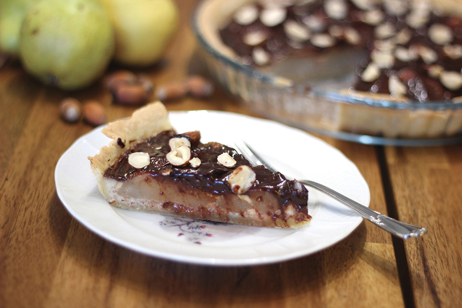 • Faites cuire la tarte pendant 44 mn à 180° jusqu’à ce qu’elle soit bien dorée. • Faites fondre le chocolat et le lait à feu doux dans une petite casserole. Mélangez pour que le chocolat soit bien lisse et versez sur la tarte. Saupoudrez de noisettes concassées.